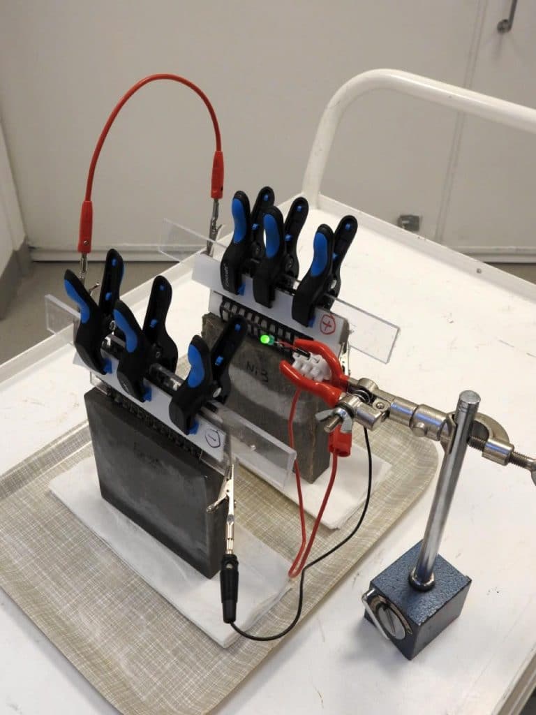 O conceito envolve primeiro uma mistura à base de cimento, com pequenas quantidades de fibras curtas de carbono adicionadas para aumentar a condutividade e a tenacidade à flexão. Então, embutida na mistura está uma malha de fibra de carbono revestida de metal – ferro para o ânodo e níquel para o cátodo. Depois de muita experimentação, este é o protótipo que os pesquisadores agora apresentam.