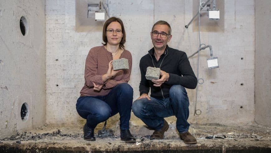 Mas isso também funciona em larga escala? Um teste de aumento de escala forneceu as evidências: os flocos foram soprados em várias molduras de madeira, ao lado de uma cavidade idêntica com flocos sem o novo aditivo, e montados usando a técnica usual. Agora era hora de ir ao laboratório de bombeiros da VKF ZIP AG, onde as molduras de madeira estavam expostas a chamas em temperaturas de 800 a 1.000 graus por uma hora. A moldura de madeira não deveria queimar a qualquer momento, nem deveriam cair flocos em brasa. O novo material de isolamento resistiu ao teste e protegeu a construção de maneira confiável, enquanto os flocos sem o aditivo caíram da estrutura de madeira por falta de aderência.